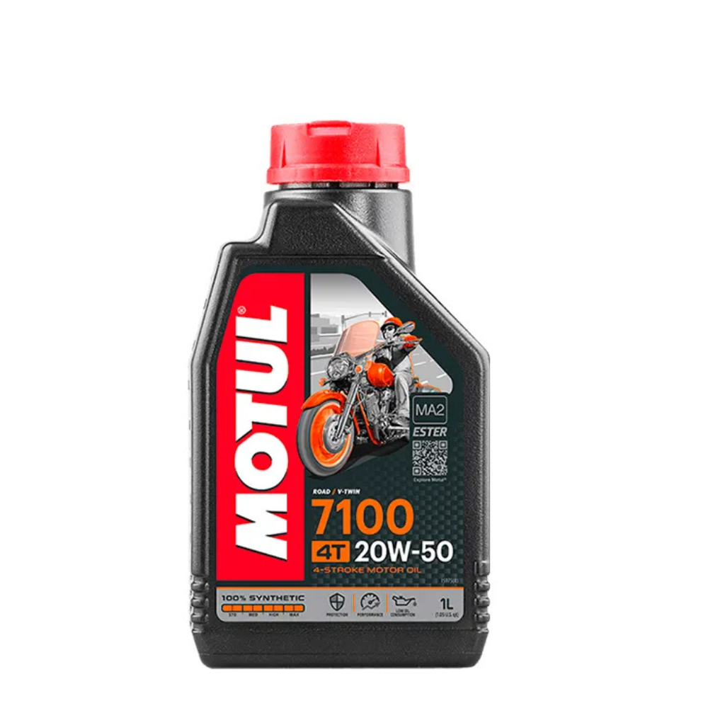 MOTUL 7100 20W50 4T es recomendado para motos ruteras, trails, motos de cross, enduro, trial… equipos de motores 4 tiempos con cajas de velocidades integradas o no y embrague bañado en aceite o en seco, motores diseñados para responder a las normas de emisiones Euro 2 o Euro 3, Euro 4, o Euro 5 equipadas con sistemas de tratamiento de gases de escape: catalizadores, inyección de aire en el escape. Grado SAE 20W-50 en caliente especialmente adaptado para los grandes motores mono o bi cilíndrico.
